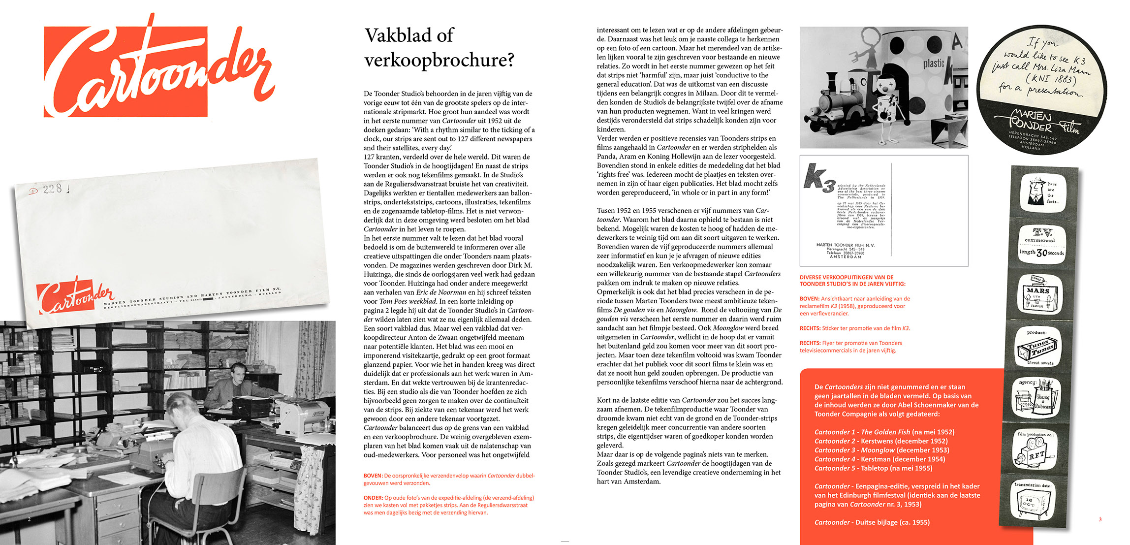Van 1952 tot en met 1955 brachten de Toonder Studio’s een onregelmatig verschijnend blad uit dat een kijkje gaf achter de schermen van het bedrijf. In dit blad, met de titel Cartoonder, ontdekte de lezer bijvoorbeeld meer over de persoon Marten Toonder en een aantal van zijn medewerkers. Ook werd in het blad uitgelegd hoe bepaalde strips en tekenfilms tot stand kwamen en welke beslissingen daarbij werden genomen. Ook werden stripreeksen als Panda en Koning Hollewijn uitgebreid aan de lezer voorgesteld.